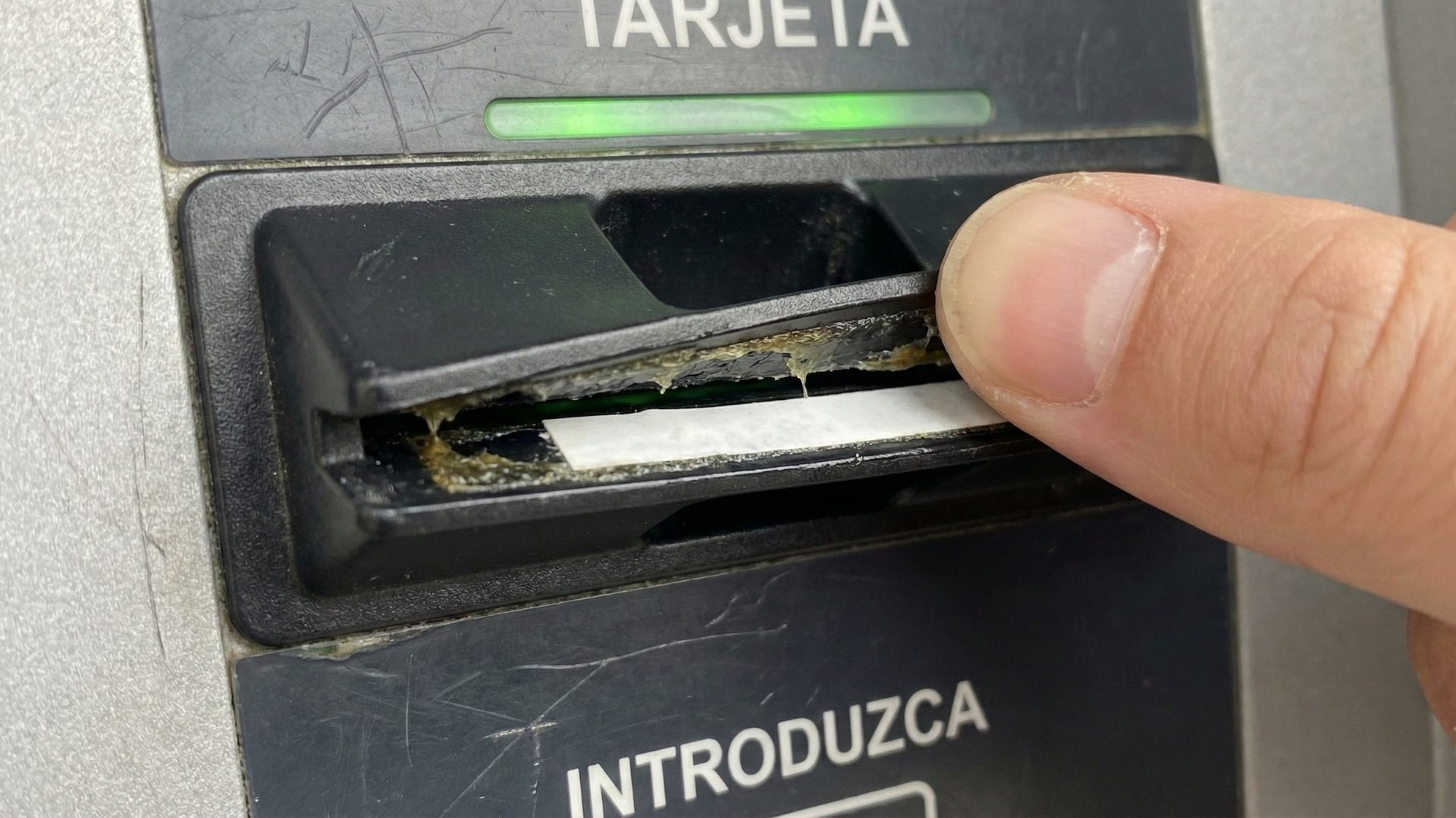 - Revisa la salida del dinero: Pasa el dedo por la ranura por donde salen los billetes. Una modalidad muy común es poner una 'regla' o una placa con pegante industrial para que los billetes se queden atrapados y tú creas que el cajero no dispensó (mientras el ladrón espera a que te vayas para ir a despegarlos).